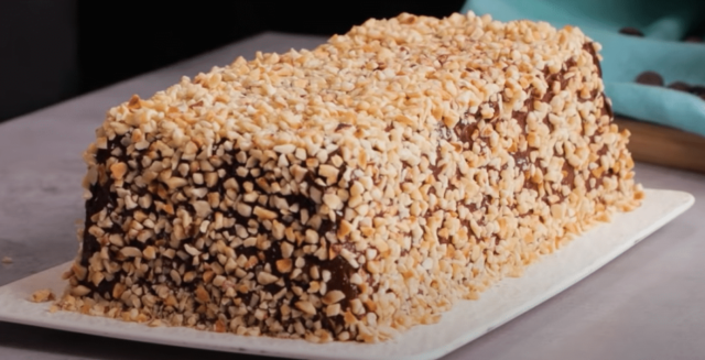 9) Po vyndání z lednice polijeme rozpuštěnou čokoládou a posypeme mletými ořechy.
