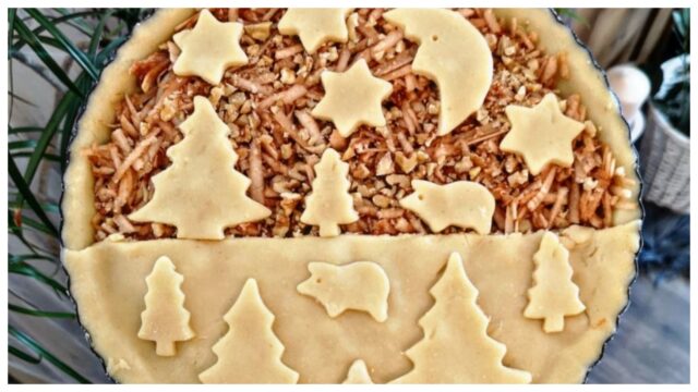 4) Dokončení koláče: Na připravené těsto v formě rozložte náplň z jablek. Zbylé těsto rozválejte a nakrájejte na proužky, které pokládejte přes jablka v mřížkovém vzoru.