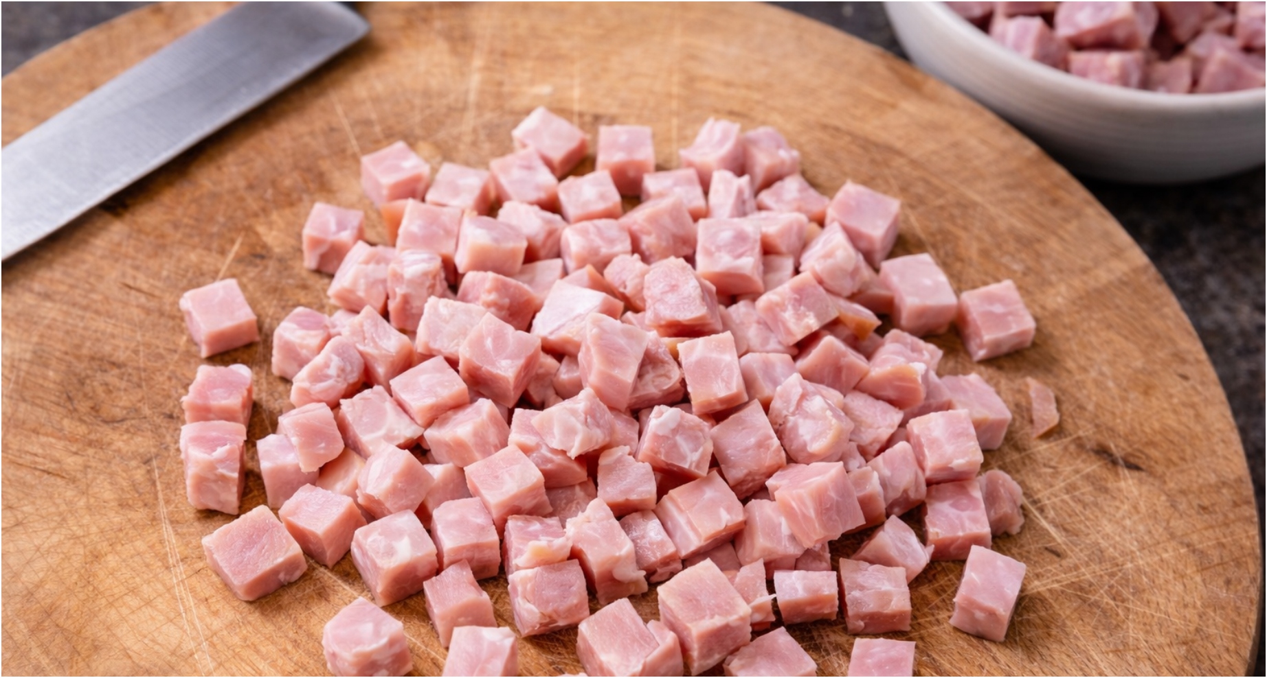 Hermelín i vejce uvařená natvrdo nastrouhám na hrubém struhadle do větší mísy. Můj tip pro vás: Pokud máte rádi v pomazánce větší kousky, sýr klidně jen nakrájejte nadrobno, ale strouhání zajistí tu nejlepší texturu. Šunku si nakrájím na menší kostičky.
