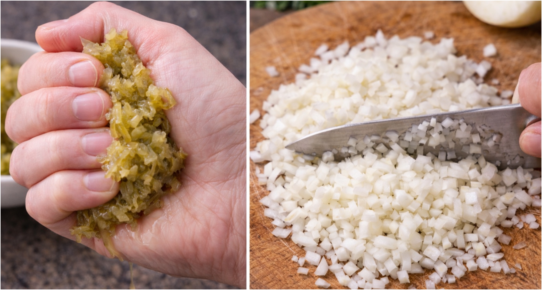 Kyselé okurky nastrouhám na jemném struhadle. Tady dělám jednu důležitou věc: Nastrouhané okurky v dlani mírně vymačkám, aby mi v pomazánce nepustily moc vody. Cibuli oloupu a nakrájím opravdu najemno, aby v pomazánce nekřupala moc agresivně.