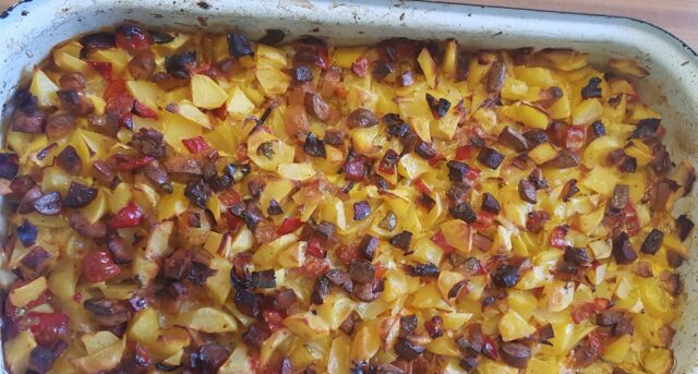 Směs urovnejte v pekáči a dejte péct do předehřáté trouby. Pečte, dokud nejsou brambory úplně měkké a uzenina krásně opečená. Doba závisí na velikosti nakrájených brambor, obvykle to trvá kolem 45 minut.
