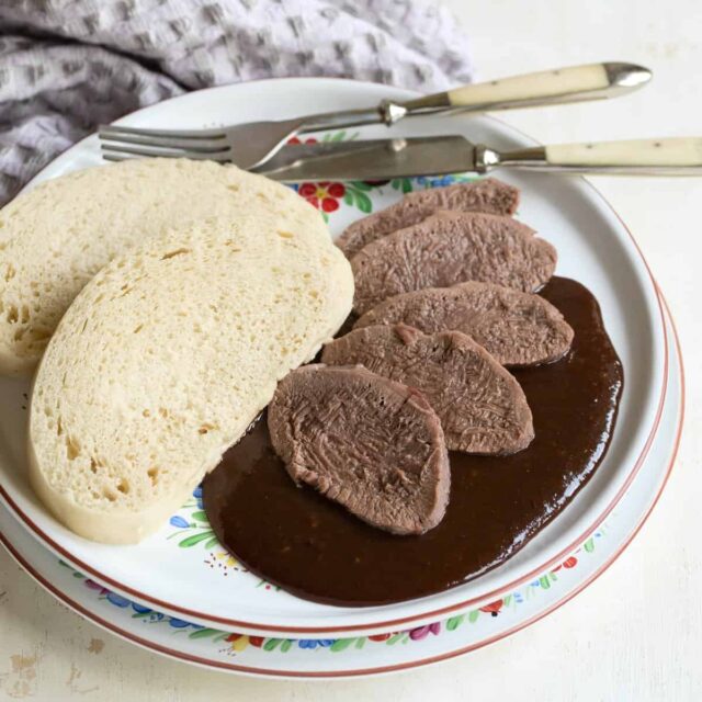 Na talíř rozprostři švestkovou omáčku, přidej několik plátků hovězího jazyka a podávej s houskovým knedlíkem. Výborné pro slavnostní příležitosti i nedělní oběd.