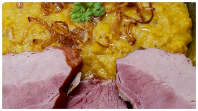 5) Servírování: Podávejte hrachovou kaši s křupavou cibulkou, polijte cibulovým olejem a doplňte plátkem uzeného masa.