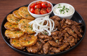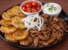 - Vepřové nudličky na sójové omáčce s česnekovými bramborovými dukátky