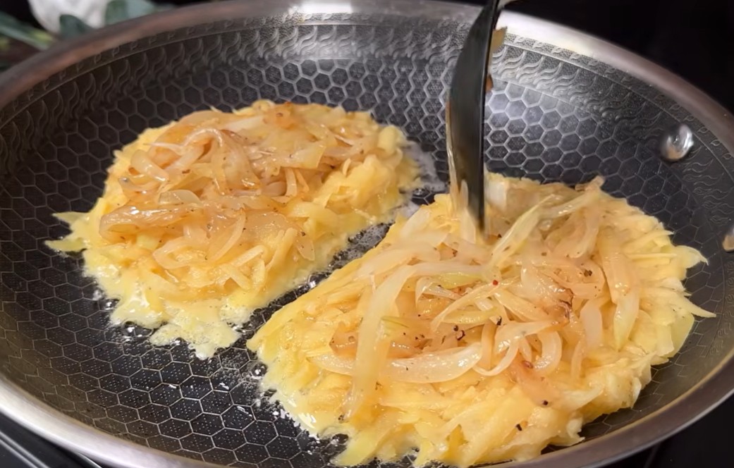 4) Na brambory přidáme osmaženou cibulku.