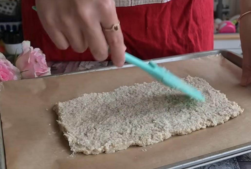 2) Směs poté navrstvíme na pečící papír.