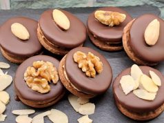 Elegance na jeden až dva kousky. Křehké kakaovo–ořechové těsto, uvnitř meruňková marmeláda a jemná ořechová náplň z másla a cukru, nahoře lesklá čokoláda s půlkou vlašského ořechu. Klasika, která se na slavnostní míse nikdy neztratí.
