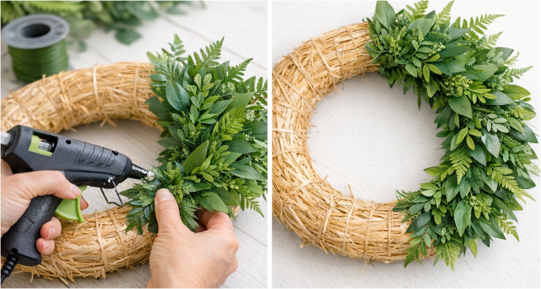 Tip: Zeleň nelepte úplně naplocho, nechte listy trochu „trčet“ směrem ven, aby věnec získal na objemu a působil přirozeně.