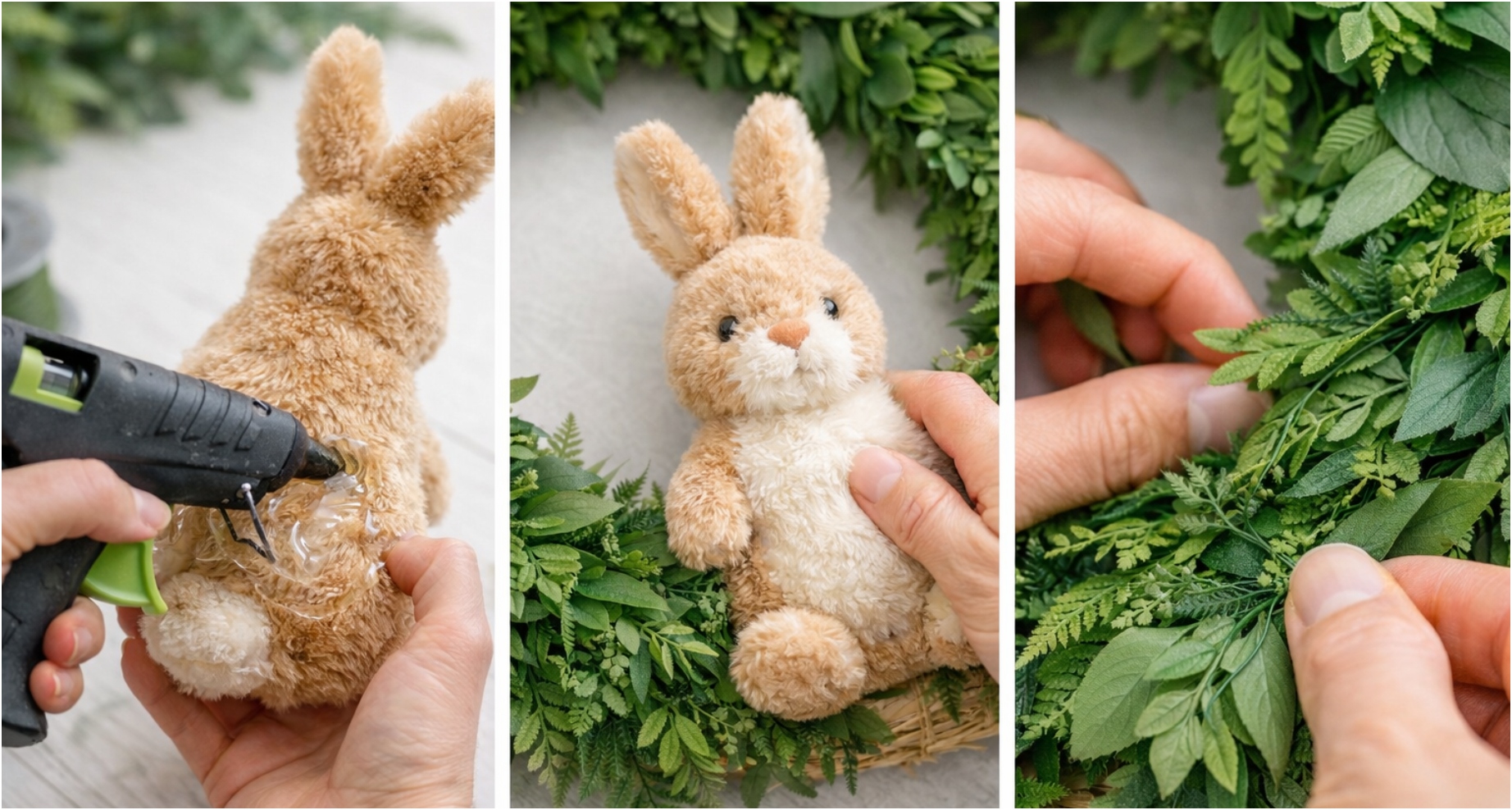Zajíčka umístěte doprostřed spodní části věnce. Pokud má zajíček pevné tělo, naneste na jeho spodní část větší množství lepidla z tavné pistole a pevně přitiskněte ke korpusu. Pro jistotu ho můžete kolem „pasu“ nenápadně přichytit drátkem, který schováte pod kožíšek.