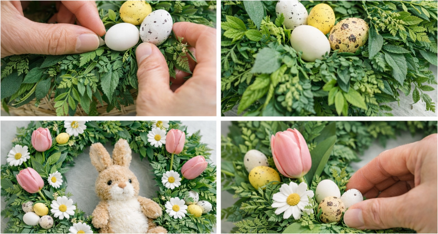 - Designérské tajemství: Použijte různé barvy (bílá, žlutá, kropenatá), věnec pak bude mít hloubku. Vajíčka vlepujte hlouběji do zeleně, aby vypadala jako v hnízdě.