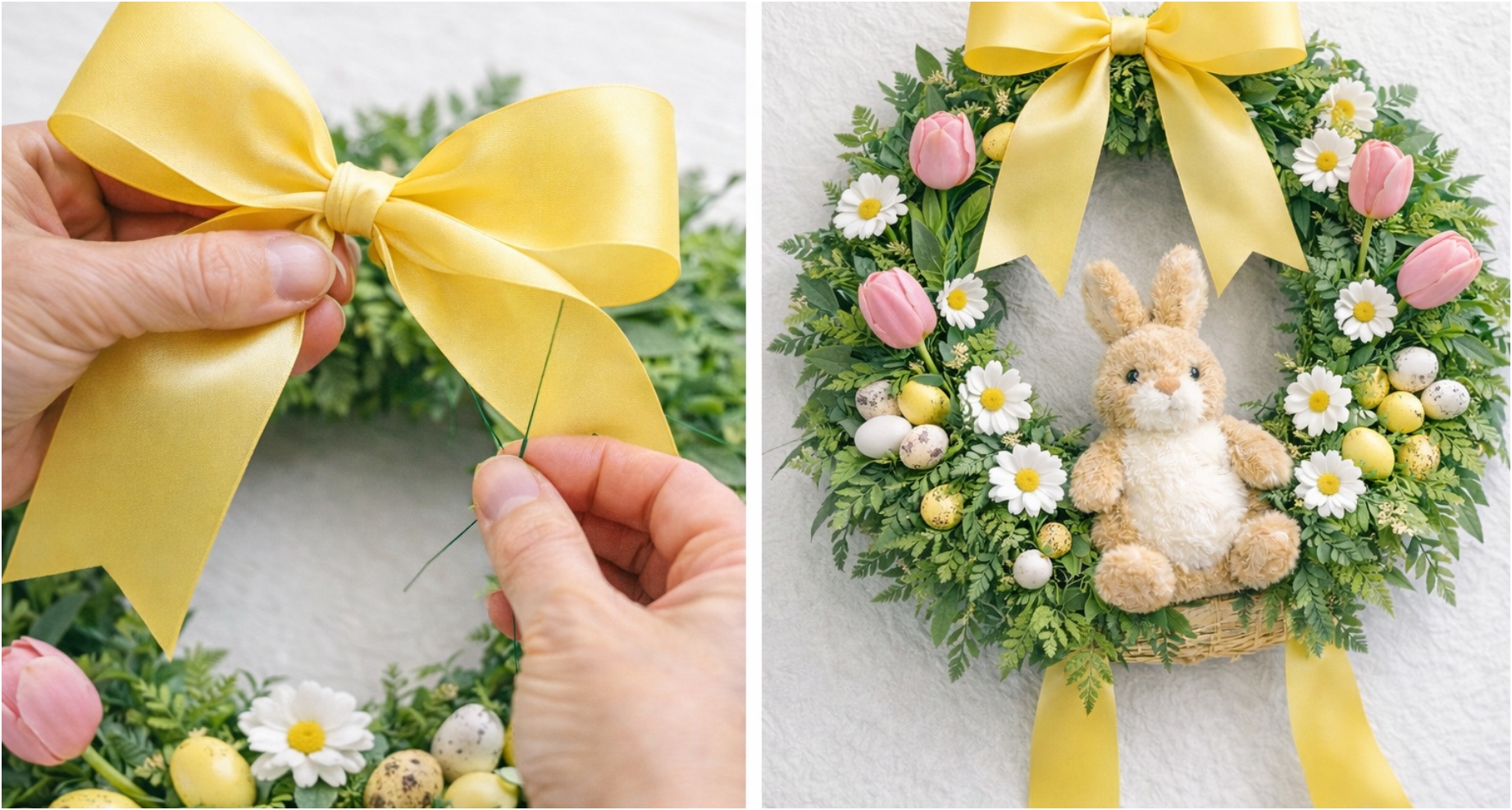 - Fixace je základ: Jarní větry umí být silné. Mašle a figurky zajistěte nejen tavnou pistolí, ale i tenkým vazačským drátkem.