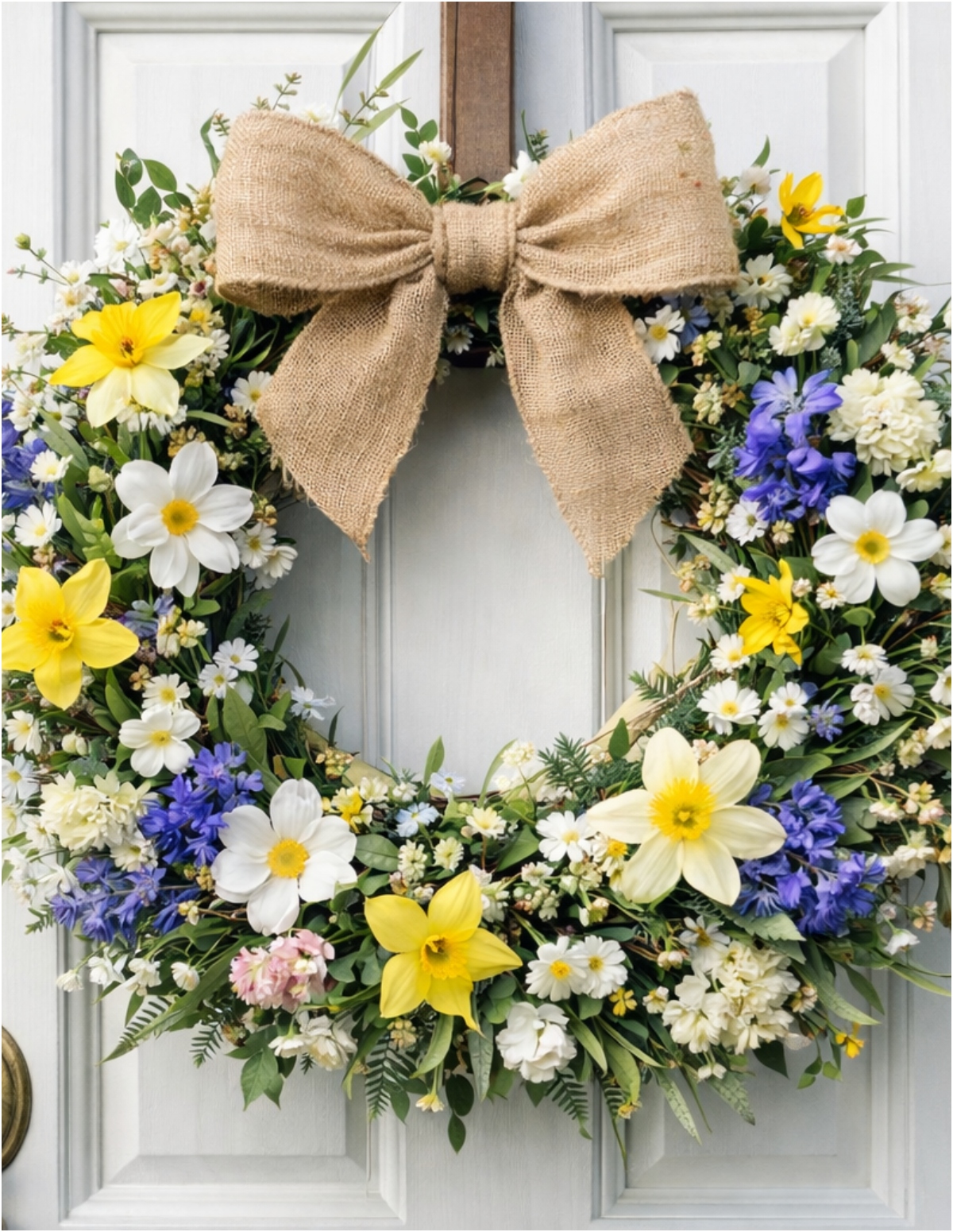 Kombinace sytě žlutých narcisů a jemně fialových hyacintů nebo modřenců je jarní klasikou, která nikdy neomrzí. Letos se k nim přidávají velké kostkované mašle, které dodávají věnci nádech francouzského venkova (Provence).