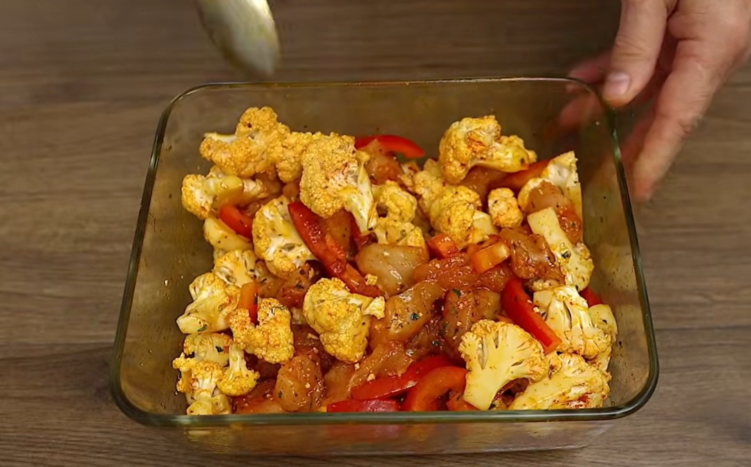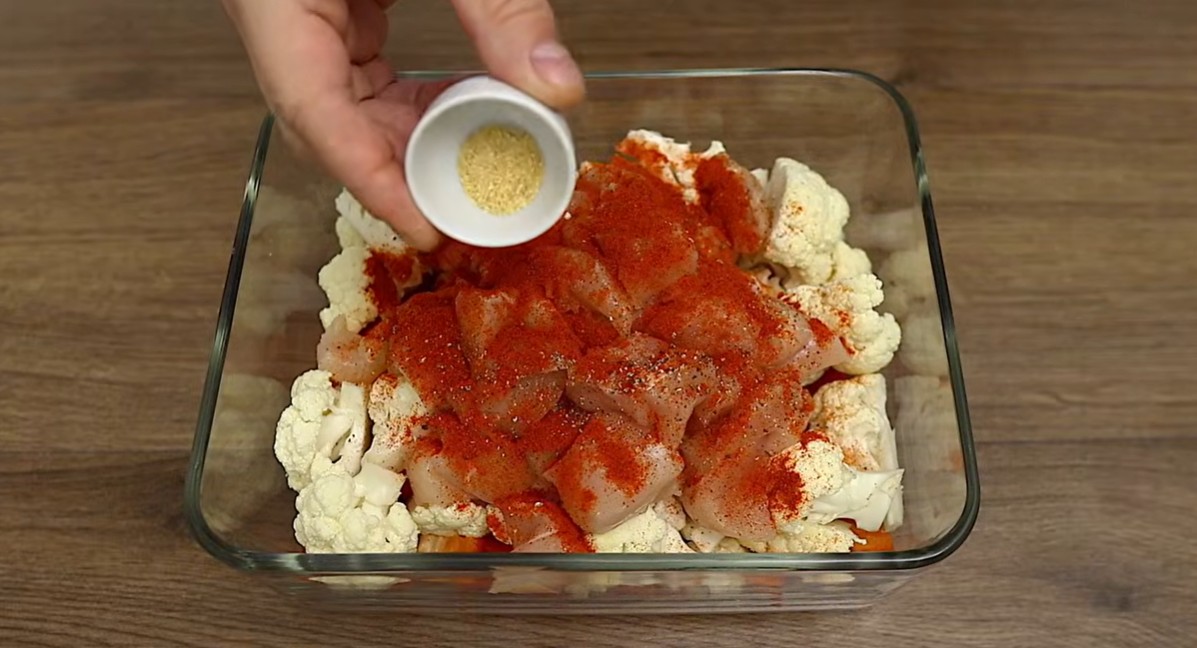 1) Smícháme si nakrájenou zeleninu a kuřecí maso. Okořeníme.