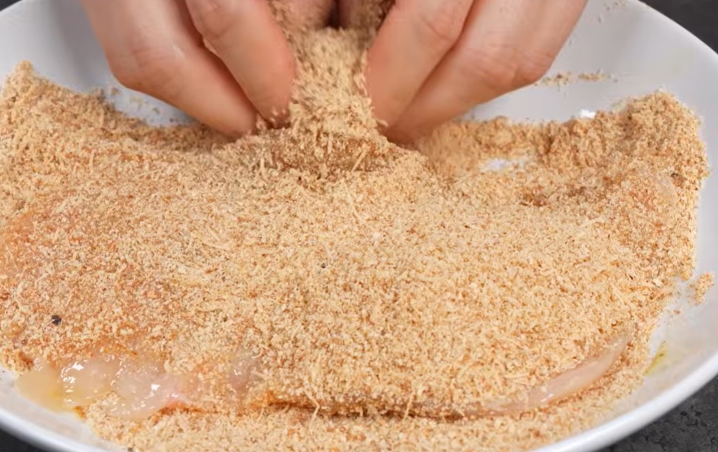 2) Kuřecí maso si nakrájíme na jemné plátky. Plátky si obalíme v oleji a poté ve strouhance.