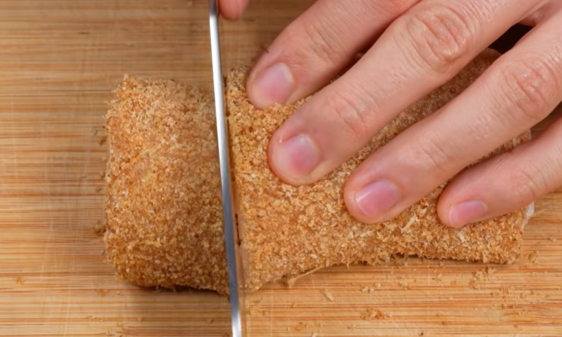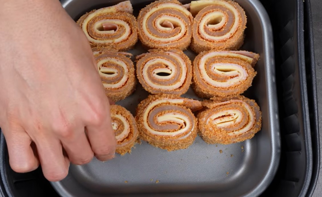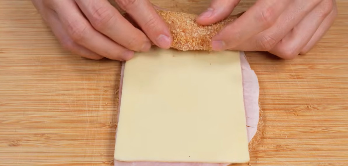 3) Na obalené maso umístíme šunku a sýr. Srolujeme do rolky a nakrájíme na jednotlivé šneky.