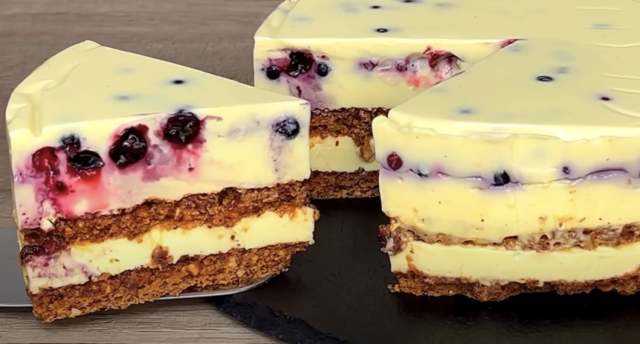 13. Následně rozprostřete rybíz zbavený šťávy, pak naneste 2/3 krému, který rozetřete, uhlaďte a přikryjte prvním dílem těsta. Potom naneste 3/3 krému, rozetřete, uhlaďte a nakonec přikryjte druhým dílem těsta. Uložte do lednice na ztuhnutí (podle potřeby).