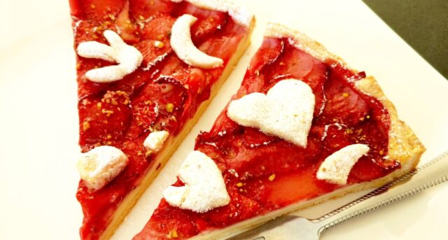 Ze zbylého kousku těsta vytvořte drobné ozdoby (mřížku, kytičky nebo srdíčka pomocí vykrajovátek) a položte je na jahody. Ozdoby potřete mlékem. Koláč pečte v předehřáté troubě na 180 °C dozlatova (cca 35–45 minut podle typu trouby).