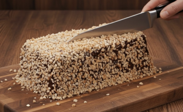 9. Po vyndání z lednice polijeme rozpuštěnou čokoládou a posypeme mletými ořechy.