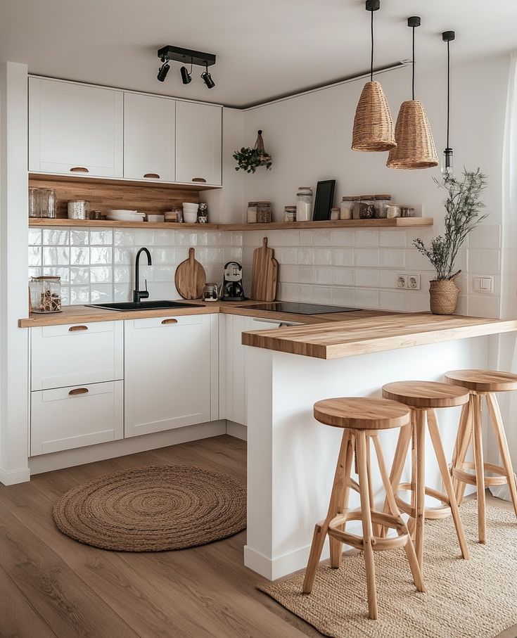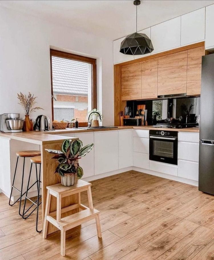 - Dřevo jako akcent: Pokud chcete bílou barvu nechat dominovat, využijte dřevo pouze na detailech – otevřených policích, barových stoličkách, úchytkách nebo na podlaze.