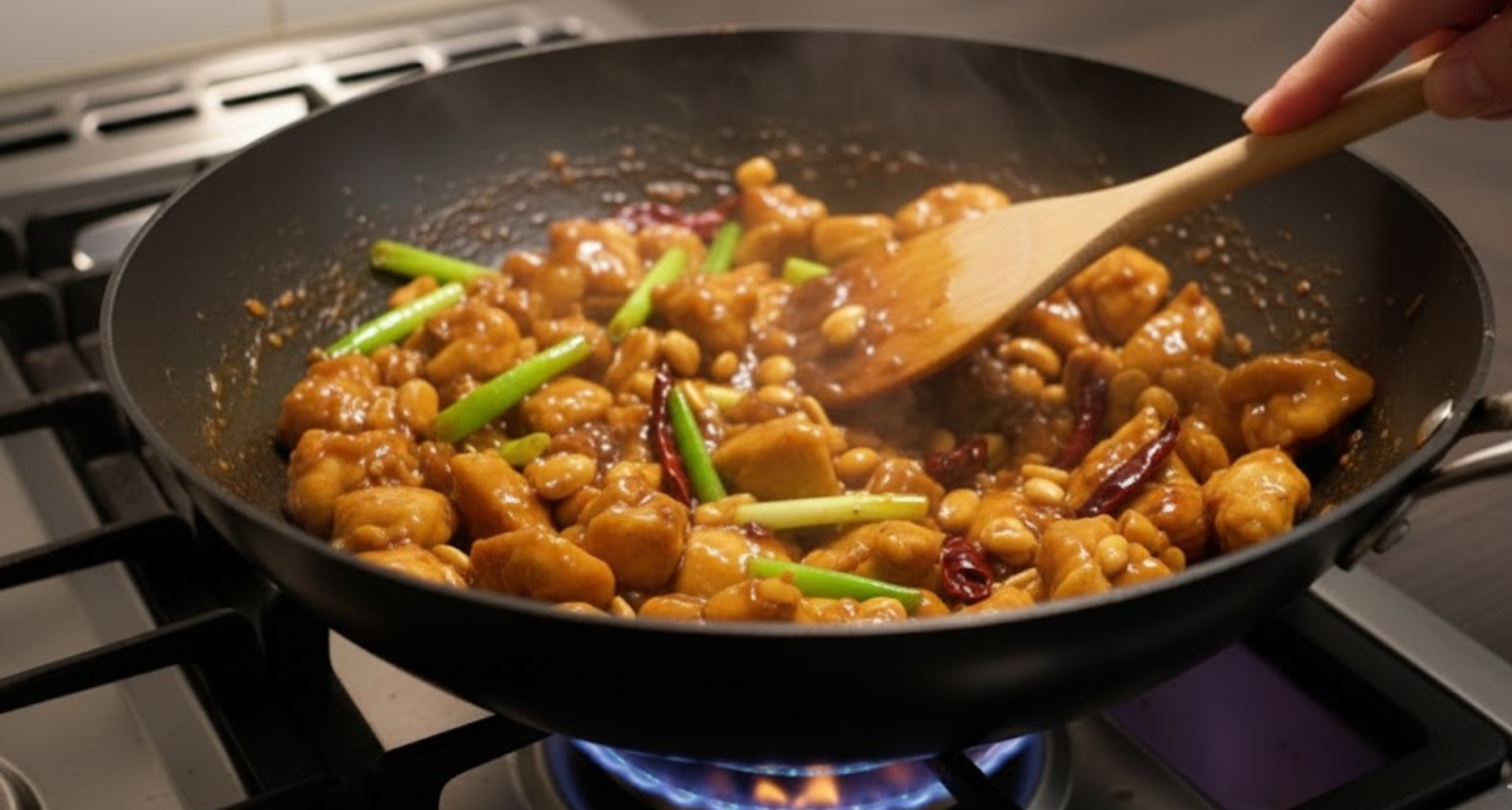 3) Vaření: Na pánvi si rozpalte olej, vložte maso a osmahněte. Přidejte česnek (může být i sušený, pokud preferujete) a případně trochu chilli. Poté maso zalijte omáčkou, nechte probublat a vmíchejte nakrájenou zelenou cibulku a arašídy.