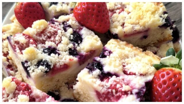 Jahody s borůvkami jsou jasná volba, ale u mě vyhrála tvarohová náplň—krémová a ne přeslazená. Příště zkusím do drobenky skořici, jak je v tipu, protože mi to v kombinaci k ovoci vždycky sedí.