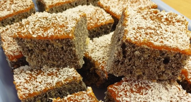 6) Dokončení (volitelné, dle názvu): Vlažný korpus potřete tenkou vrstvou meruňkové marmelády a posypte strouhaným kokosem. Nechte zchladnout a krájejte.