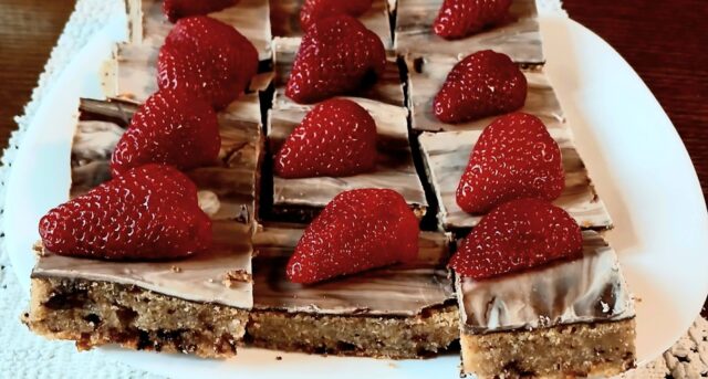 Těsto nalijte na připravený plech a rovnoměrně rozetřete. Vložte do trouby a pečte při 180 °C přibližně 35–40 minut. Upečenost zkontrolujte špejlí – musí po vytažení z těsta zůstat čistá a suchá.