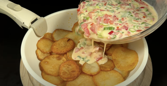 3) Kombinace a vaření: Směs s vejci a zeleninou nalijte na pánev k osmaženým bramborám.