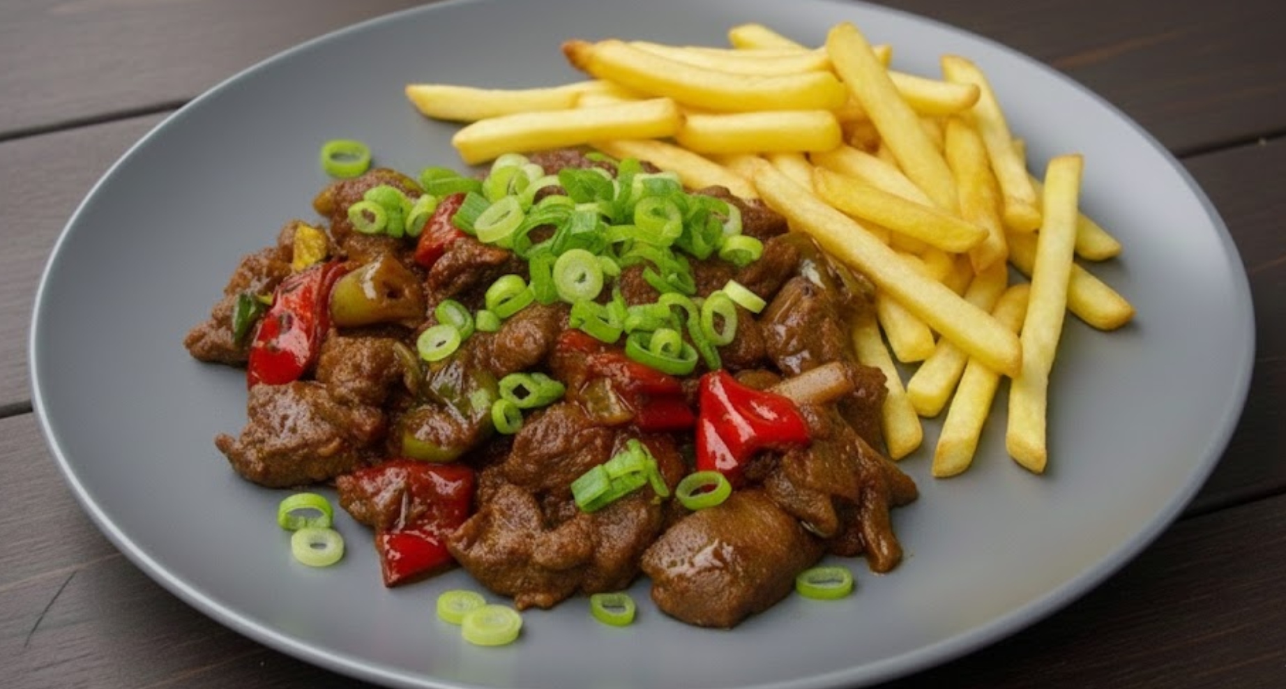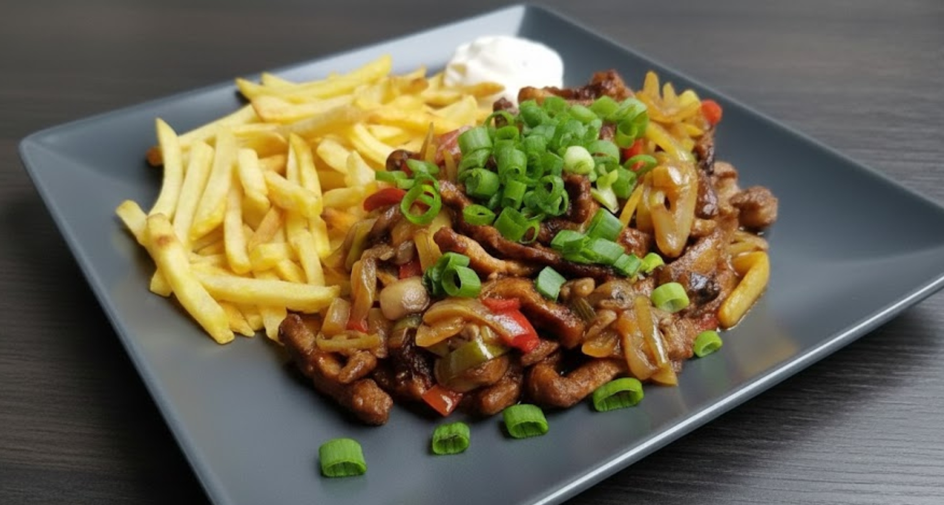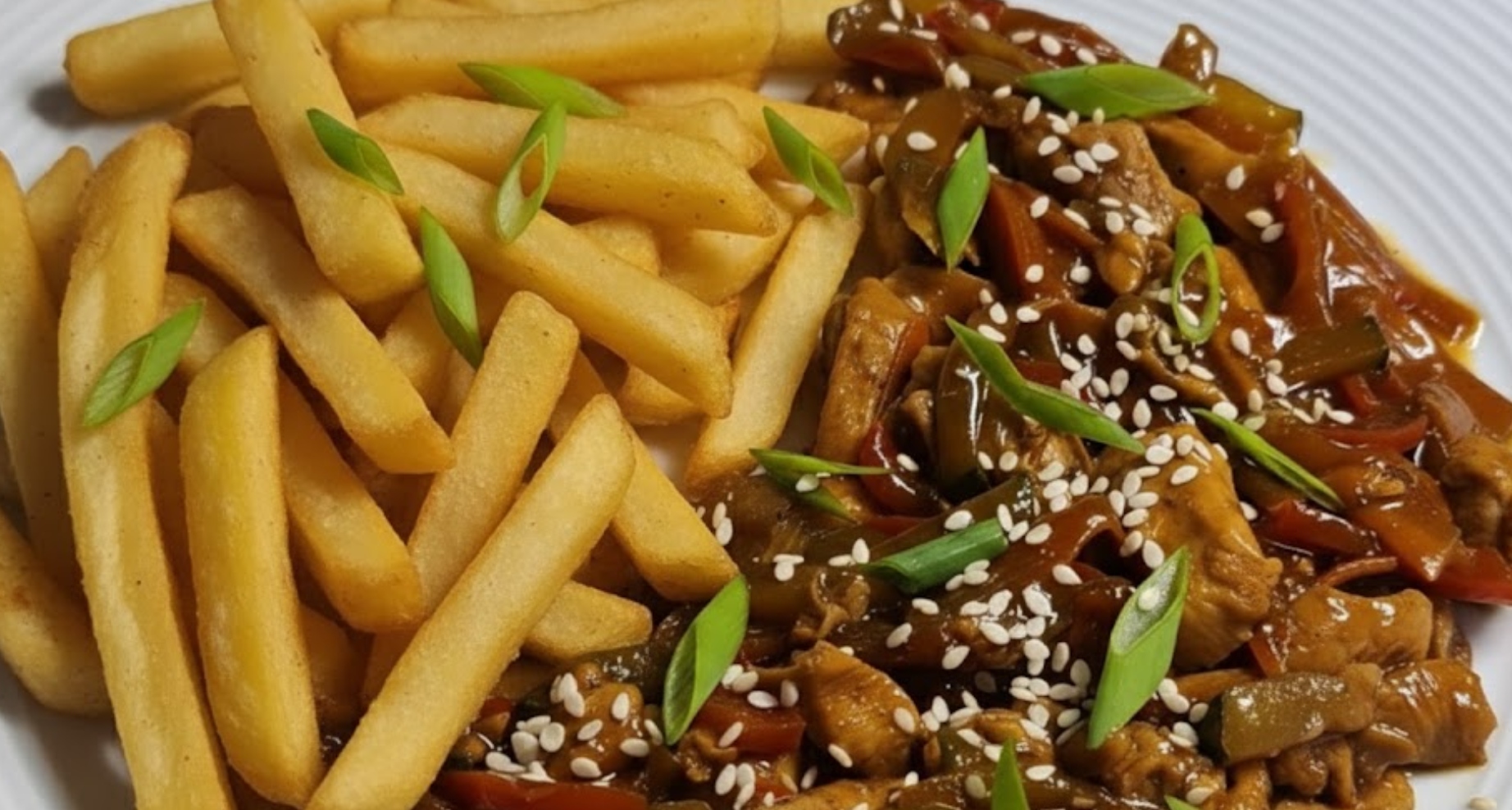 Další skvělá varianta domácí číny, která sází na jednoduchou marinádu ze sójovky a trochy cukru pro vyvážení chutí. Rychlé restování masa s cibulí a paprikami vytvoří barevné a lákavé jídlo. Škrob v marinádě zajistí, že se na mase vytvoří jemný lesklý film, který v sobě drží všechnu šťávu. Skvělá a rychlá večeře, kterou hranolky povýší na oblíbený comfort food.