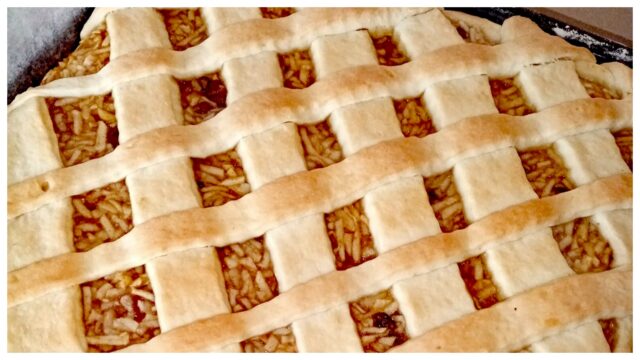 3) Formování: Těsto rozdělte na dvě části. Jednu část rozválejte a položte na dno vymazaného plechu. Na těsto rozprostřete jablečnou náplň. Z druhé části těsta vytvořte mřížku a pokryjte jí náplň.