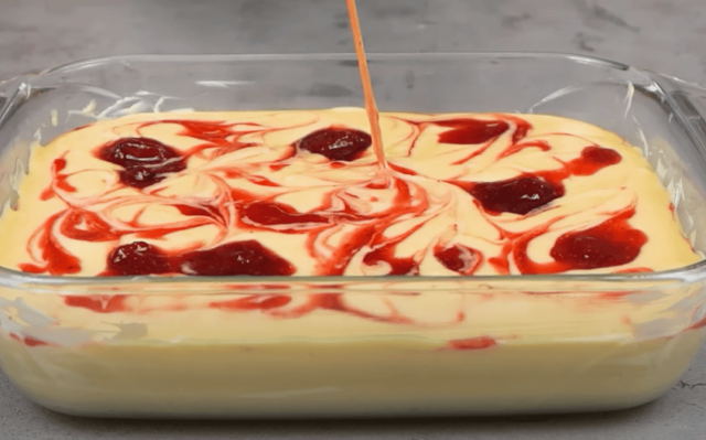 5) Přidáme jahodový džem a pomocí špejle jej rozprostřeme.