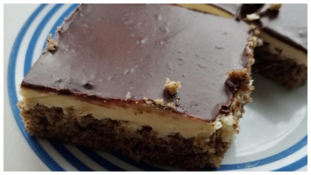 5) Dokončení: Na vychladlé těsto naneste krém a celé to přelijte čokoládovou polevou. Nechte v lednici řádně ztuhnout.