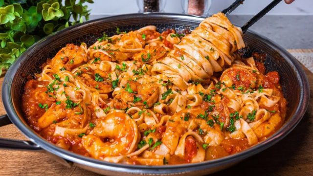 Těstoviny na rajčatech se smaženými krevetami