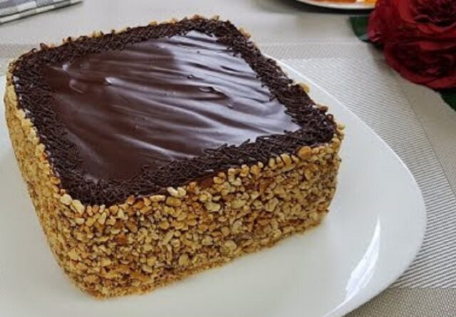 2) Poté pokračujte ve skládání dortu a přidejte následující vrstvené komponenty: 1/3 krému z hořké čokolády – 1/3 nasekaných arašídů – 1/3 krému z hořké čokolády – vrstva sušenek – 1/3 krému z hořké čokolády.