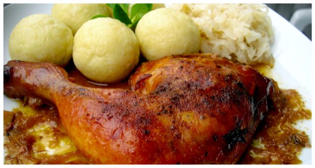 - Hotové kuřecí stehna servírujeme s bramborovým knedlíkem a kysaným zelím.