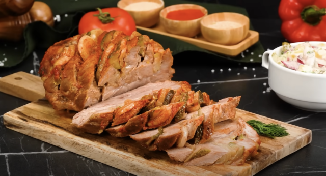 Tento recept na pečenou vepřovou krkovici plněnou hořčicí, cibulí a nakládanými okurkami v rajčatové omáčce je skvělou volbou pro všechny, kteří si chtějí pochutnat na bohatě ochuceném a šťavnatém masu. Kombinace hořčice, sladké cibule a křupavých okurek dodává masu nezapomenutelnou chuť. Podávané s osvěžujícím salátem, tento pokrm slibuje pestrý gastronomický zážitek, který potěší každého milovníka masa. Ideální pro nedělní oběd nebo speciální příležitosti!