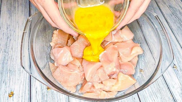 1) Kuřecí prsa nakrájejte na kousky. Vložte je do hluboké mísy.