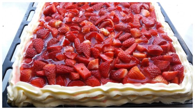 3) Sestavení dezertu: Na upečený a vychladlý piškot rovnoměrně rozetřeme krém. Okraje piškotu ozdobíme tak, aby držely želatinu. Na krém poklademe nakrájené jahody a přelijeme připravenou želatinou. Dezert necháme ztuhnout několik hodin v lednici.
