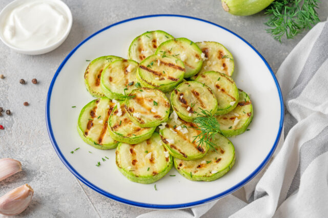5) Servírování: Hotové plátky cukety přendejte na talíř. Ozdobte je nasekaným čerstvým koprem. Podávejte jako přílohu nebo lehké hlavní jídlo.