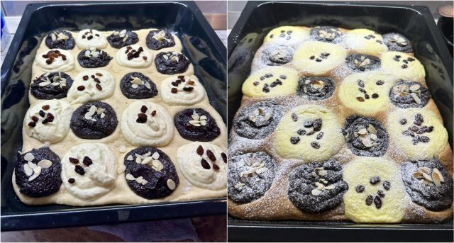 Vykynuté těsto rozdělte na dva díly. Každý rozválejte na plát a bohatě naplňte připravenou náplní. Můžete vytvořit dvě velké rolády (závin) nebo těsto nakrájet na čtverce a balit klasické české buchty. Položte na plech s pečicím papírem a nechte ještě 15 minut dokynout.