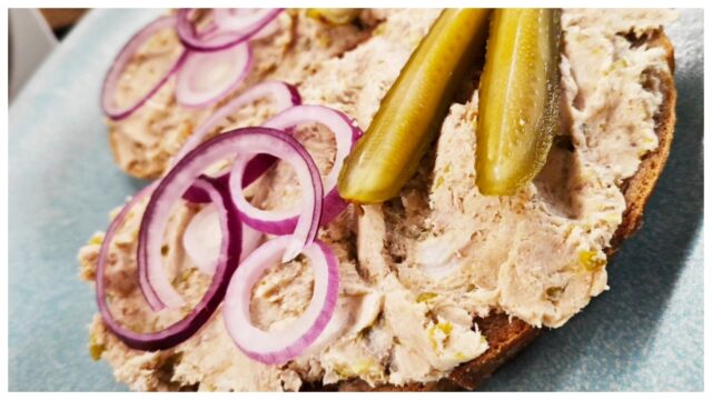 4) Servírování: Pomazánku můžeme podávat na čerstvém chlebu, toastu nebo jako náplň do sendvičů. Skvěle se hodí i jako náplň do lívanců nebo na pečivo při pikniku.