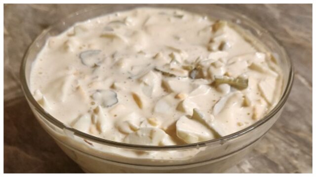 Já dávám okurek trochu víc, protože mám ráda tu sladkokyselou chuť, ale pak přidám méně hořčice, aby se to nepřebilo. Vydrží i na druhý den, jen zamíchat před podáváním.