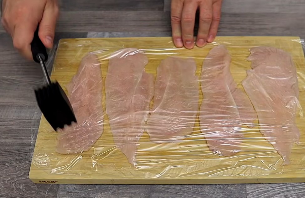 3) Kuřecí maso si nakrájíme ne tenké plátky a naklepeme.
