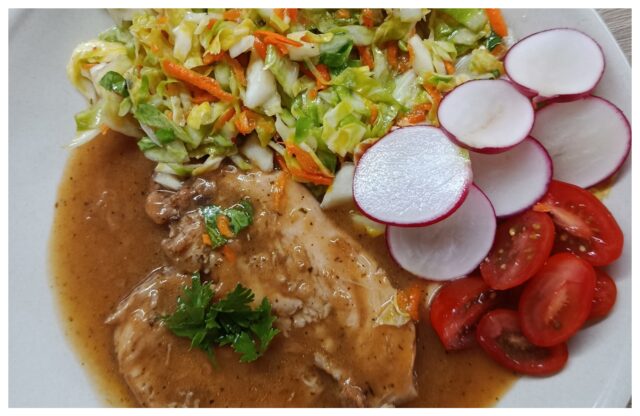 Maso hezky doměkka a ta šťáva po zahuštění není vůbec špatná. Jen bych přidal víc pepře a k salátu klidně i trochu kmínu, podle mě to chuť posune.