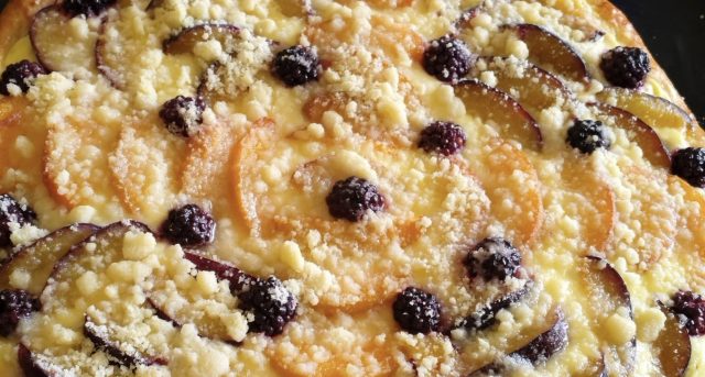 Ingredience kynutý koláč s tvarohem, meruňkami, švestkami a ostružinami