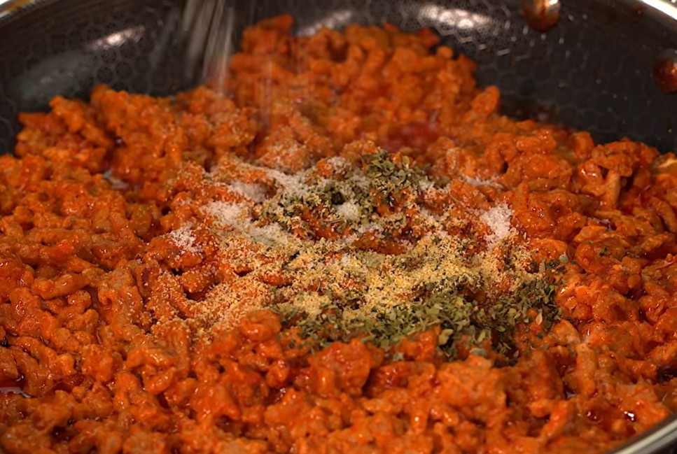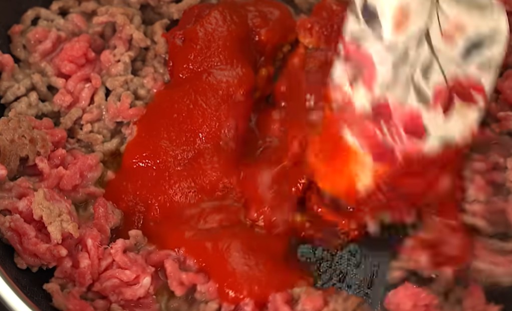1) Začneme si smažit mleté maso. Po chvilce přidáme 60 ml protlaku.
