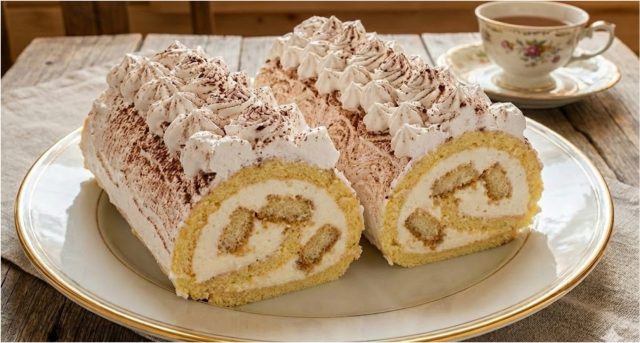 - Krájení: Roládu krájejte až po důkladném vychlazení. Piškoty uprostřed vytvoří v řezu krásný efekt připomínající klasické Tiramisu.