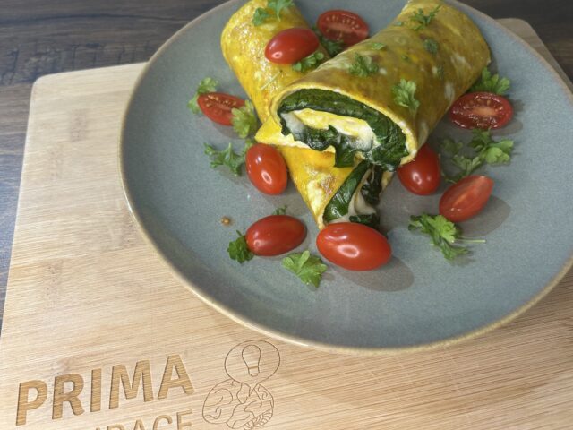 Hledáte rychlou, zdravou a zároveň lahodnou variantu snídaně, oběda nebo lehké večeře? Omeleta je skvělým základem, který lze snadno obměnit podle chuti. Tentokrát si ji připravíme s čerstvým špenátem, smetanovou pomazánkou a rozpuštěným sýrem, a nakonec ji zabalíme do rolky. Výsledkem je dokonale vláčný a nadýchaný pokrm, který vás zasytí, ale zároveň nezatíží.