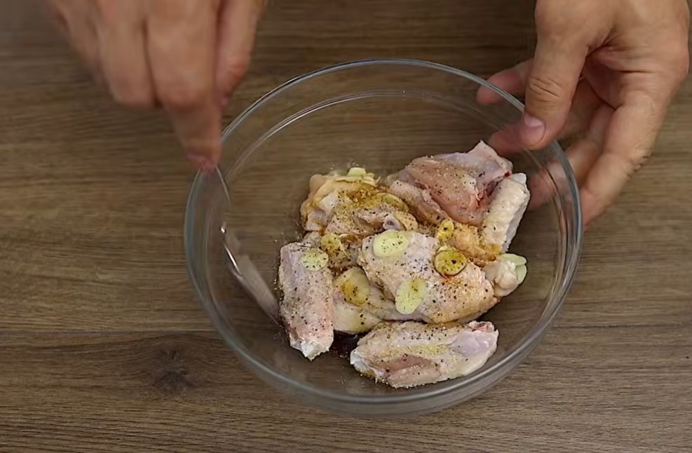 1) Křídla si smícháme se sojovkou, cukrem a česnekem. Osolíme, opepříme.