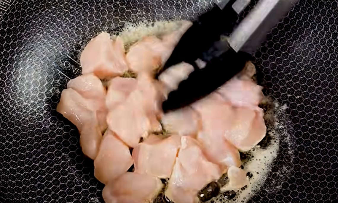 3) Jakmile nám omáčka zhoustne přidáme kuřecí maso.